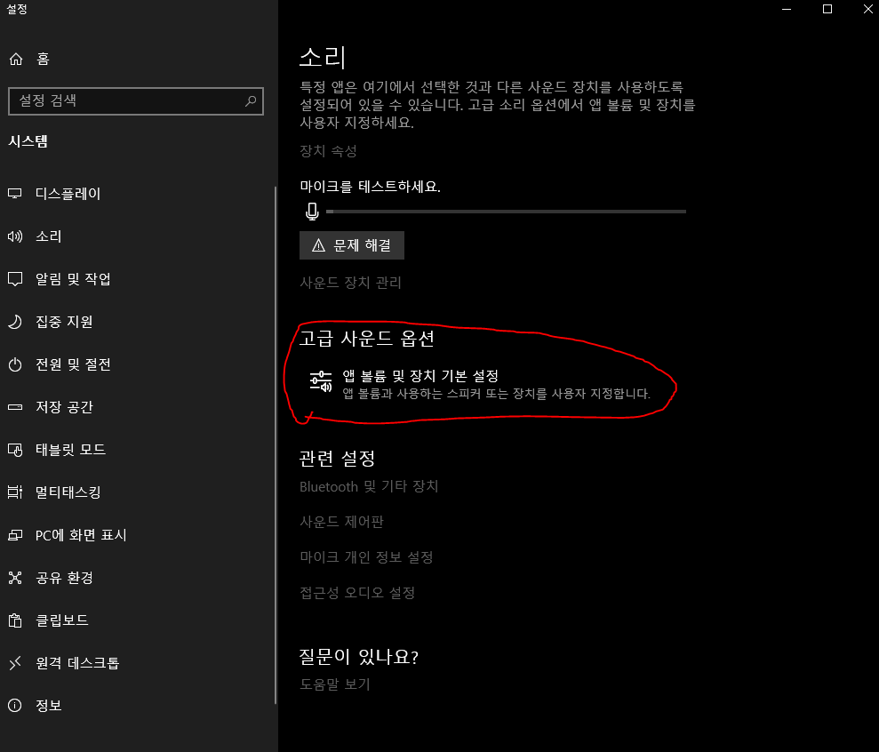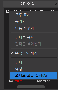 이제 소리가 나오게 해보자 밑의 톱니바퀴 버튼을 눌러서 나오는 팝업메뉴에서 오디오 고급설정을 연다.