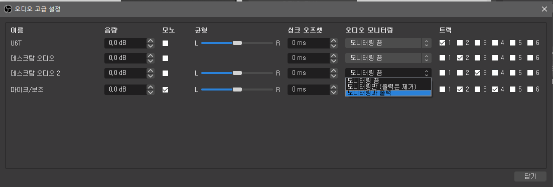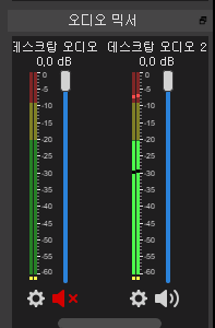 오디오 모니터링에서 '데스크탑 오디오2'를 모니터링과 출력으로 바꾸면 소리가 나온다.
