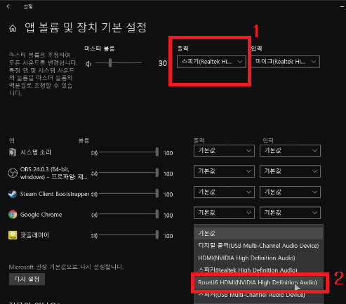 소리를 분리하고 싶은 프로그램의 드롭다운 버튼을 누르고 쓰지않는 오디오 출력으로 바꿔준다. (그러면 소리가 나지 않을 것이다 나중에 OBS에서 해결할테니 일단 넘어가자)